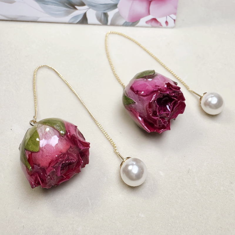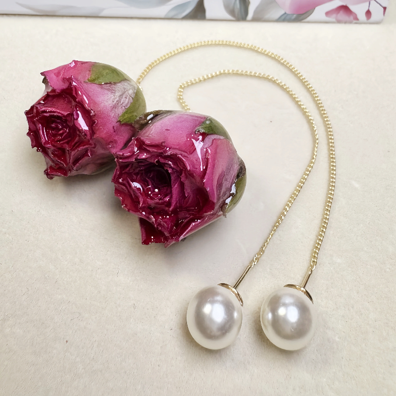 Rose Pearl Earrings, Real Flower, long chains red rose